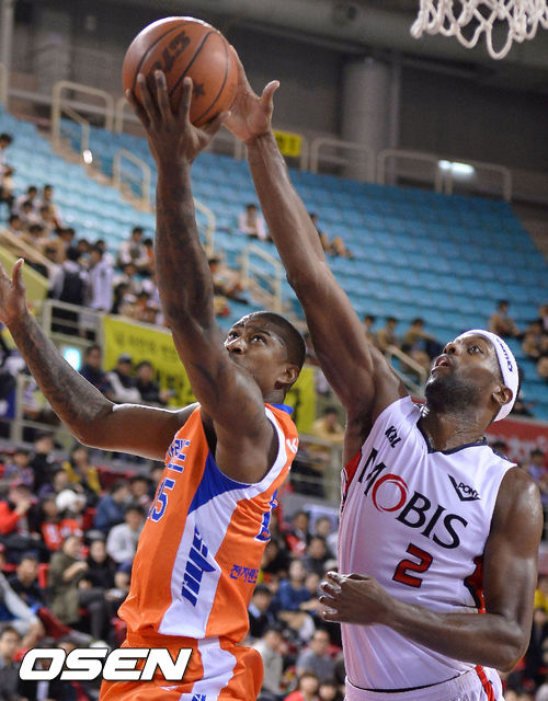 3쿼터, 전자랜드 포웰이 모비스 벤슨의 수비를 피해 골밑슛을 하고 있다.