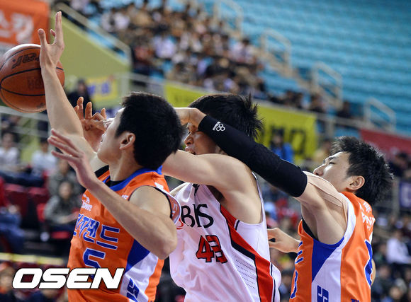 4쿼터, 전자랜드 김상규 정영삼과 모비스 이대성이 볼다툼을 하고 있다.