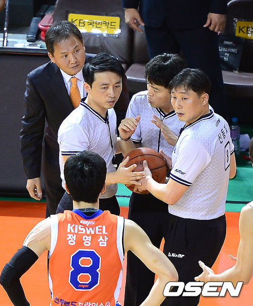 4쿼터 모비스 유재학 감독이 심판진의 판정 논의에 귀기울이고 있다.