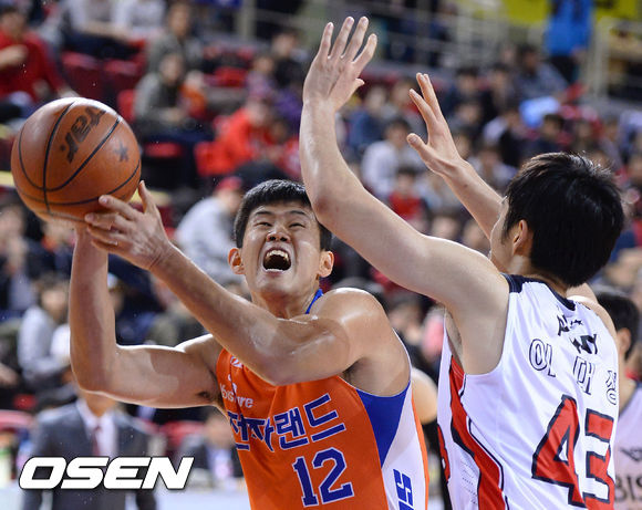 4쿼터, 전자랜드 한정원이 모비스 이대성 수비를 피해 골밑슛을 시도하고 있다.