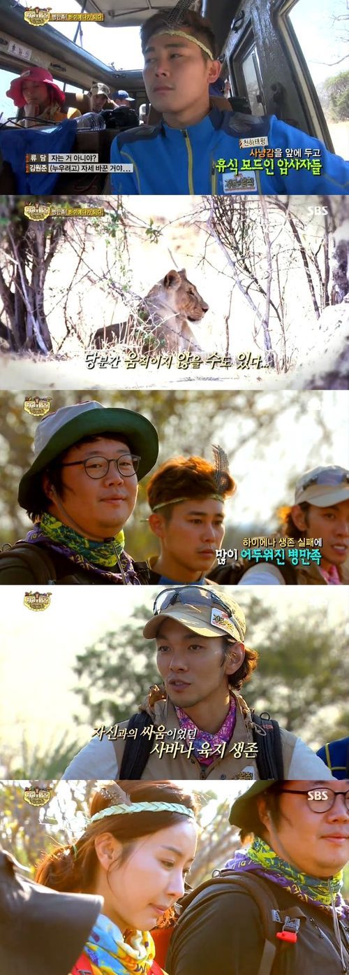 8일 오후 방송된 SBS 예능프로그램 '정글의 법칙 in 사바나'(이하 정글의 법칙)에서는 사자가 먹이를 먹을 때를 기다렸다 그것을 빼앗는 하이에나 식 생존 도전을 포기하는 병만족의 모습이 그려졌다.