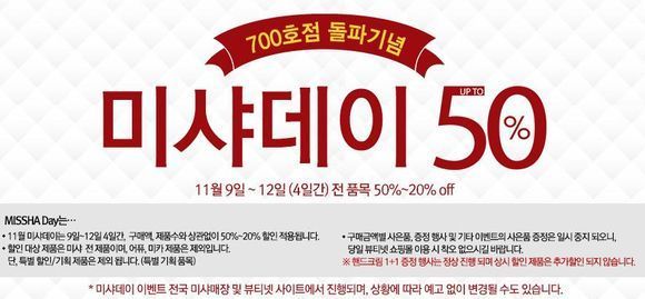 11월 미샤데이는 구매액과 제품수에 상관없이 할인이 적용된다. 이번 행사는 700호점 돌파 기념이다.