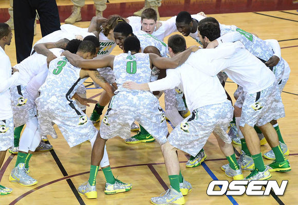 9일 오전 경기도 평택 주한미군기지 캠프 허프리스(Camp Humphreys)에서 열린 미국 대학농구 NCAA 개막전 시작전 오리건 선수들이 화이팅을 외치고 있다.