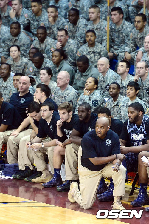 9일 오전 경기도 평택 주한미군기지 캠프 허프리스(Camp Humphreys)에서 열린 미국 대학농구 NCAA 개막전에서 오리건 존 톰슨 3세 감독이 경기를 지켜보고 있다.