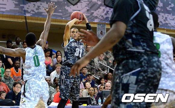 9일 오전 경기도 평택 주한미군기지 캠프 허프리스(Camp Humphreys)에서 열린 미국 대학농구 NCAA 개막전에서 조지타운 스티븐 도밍고가 슛을 시도하고 있다.
