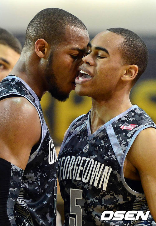 9일 오전 경기도 평택 주한미군기지 캠프 허프리스(Camp Humphreys)에서 열린 미국 대학농구 NCAA 개막전에서 조지타운 스탁스와 트라윅이 서로를 격려하고 있다.