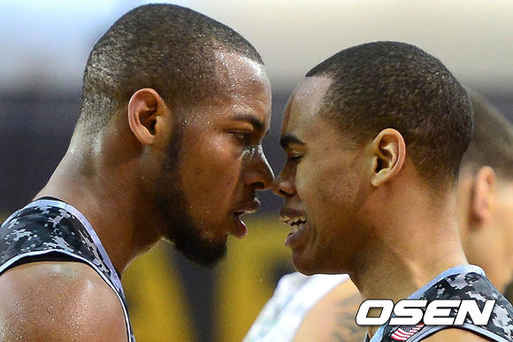 9일 오전 경기도 평택 주한미군기지 캠프 허프리스(Camp Humphreys)에서 열린 미국 대학농구 NCAA 개막전에서 조지타운 스탁스와 트라윅이 서로를 격려하고 있다.