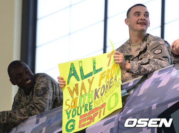 9일 오전 경기도 평택 주한미군기지 캠프 허프리스(Camp Humphreys)에서 열린 미국 대학농구 NCAA 개막전에서 한 미군이 피켓을 들고 응원을 하고 있다.