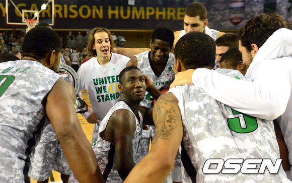 9일 오전 경기도 평택 주한미군기지 캠프 허프리스(Camp Humphreys)에서 열린 미국 대학농구 NCAA 개막전에서 승리한 오리건 선수들이 기쁨을 나누고 있다.