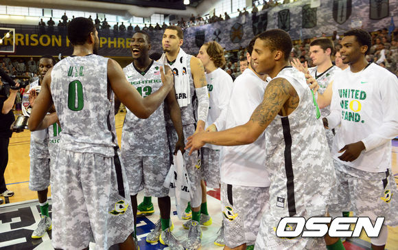 9일 오전 경기도 평택 주한미군기지 캠프 허프리스(Camp Humphreys)에서 열린 미국 대학농구 NCAA 개막전에서 승리를 거둔 오리건 선수들이 기쁨을 나누고 있다.