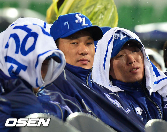 9일 오후 대구시민야구장에서 열린 삼성 라이온즈 '프로야구 최초 통합 3연패 기념 2013 팬 페스티벌'서 이승엽이 축하무대를 보며 환하게 웃고 있다.