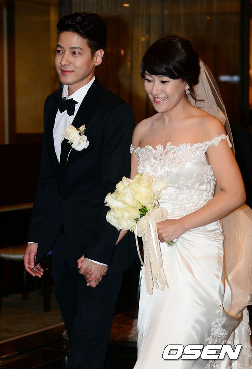 9일 오후 서울 청담동 애니버셔리 웨딩홀에서 결혼식을 올리는 배우 정민이 아내 오지은 씨와 기자회견장에 입장하고 있다.