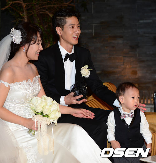 9일 오후 서울 청담동 애니버셔리 웨딩홀에서 결혼식을 올리는 배우 정민이 취재진들에게 자신의 아들을 소개하고 있다.