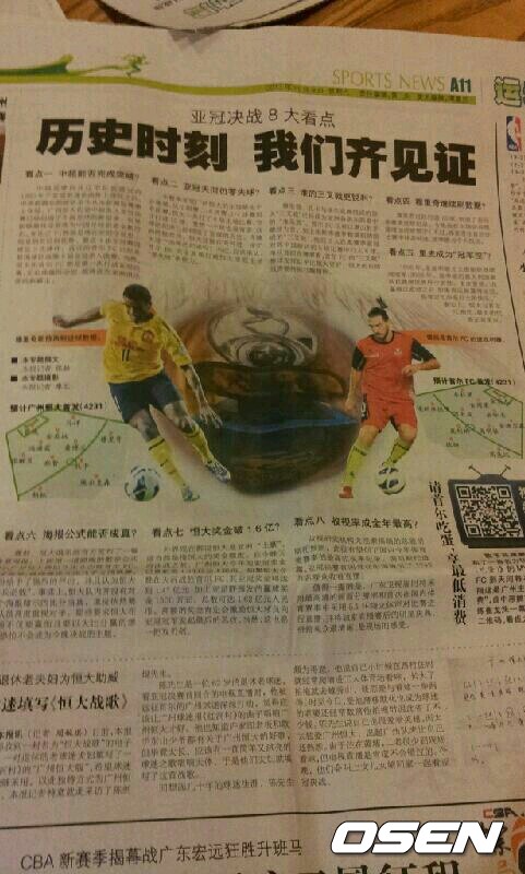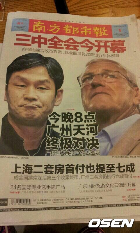 중국 일간지인 남방도시보는 9일 신문 1면에 최용수 감독과 마르첼로 리피 감독의 사진을 걸고 ACL 결승 2차전을 대대적으로 광고했다.