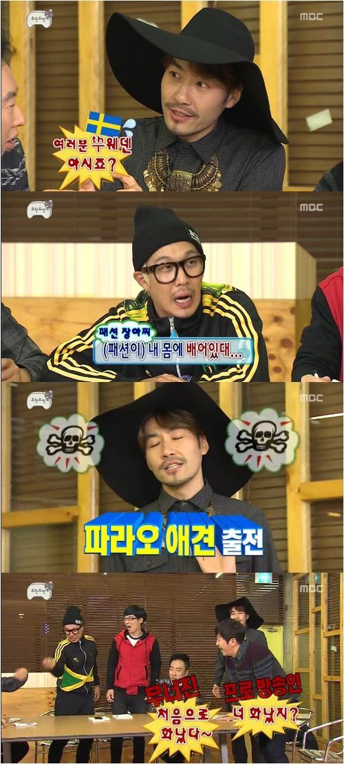 그는 기상천외한 큰 모자를 쓴 후 자신감을 표했지만 멤버들은 “마법사다”, “이집트에 가면 있는 강아지 의상 같다”며 놀려댔다. 하지만 노홍철은 꿋꿋히 자신은 패션쇼에 서도 되는 감각과 몸매를 가지고 있다고 주장해 웃음을 자아냈다.