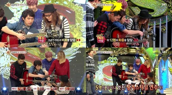 9일 오후 방송된 SBS 예능프로그램 '놀라운 대회 스타킹(이하 '스타킹)'에서는 기타 두 개가 합쳐져 있는 더블넥 기타를 5명이서 연주하는 모습이 그려졌다.