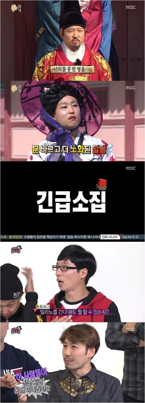 ‘무한도전’은 9일 멤버들의 관상을 분석해 조선시대 신분제도로 구분하는 관상 특집을 마련했다. 왕의 상을 가진 정형돈, 양반 상인 유재석을 필두로 중인인 정준하와 박명수, 천민인 노홍철, 하하, 길은 각자 조선시대 복장을 갖춰입고 상황극을 펼쳤다. 하지만 제작진은 5분도 되지 않아 방송을 접고 미리 공지했던 패션쇼 도전의 실마리를 풀어내기 시작했다.