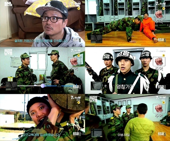 9일 오후 방송된 케이블채널 tvN 예능프로그램 'SNL코리아'에서는 인기코너 'GTA'의 새 버전인 'GTA 군대'가 공개돼 웃음을 줬다.