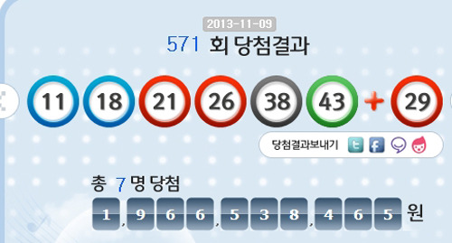 지난 11월 9일 제 571회 나눔 로또 복권 당첨번호 추첨 결과 1등 당첨번호는 '11,18, 21, 26, 38, 43'이다. 로또 571회 2등 보너스 번호는 '29'로 결정됐다. 특히 7명의 1등 당첨자 가운데 경남지역 세 곳에서 잭팟의 주인공이 나왔다.