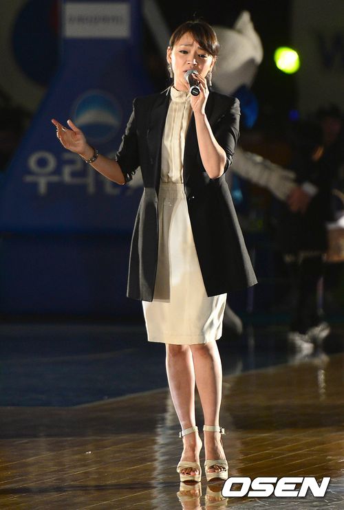10일 오후 춘천 호반체육관에서 열리는 '우리은행 2013-2014 여자프로농구' 개막전 우리은행 한새와 신한은행 에스버드의 경기를 앞두고, 뮤지컬배우 김소현이 멋진 공연을 선보이고 있다.