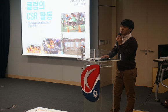 K리그 클래식팀 중 가장 활발한 사회공헌활동을 전개하고 있는 대구FC 김현희 팀장은 '클럽의 CSR 활동'을 주제로 대구FC와 타구단의 CSR활동을 소개했다. 김현희 팀장은 "클럽의 CSR 활동에 대한 인식이 제대로 되어 있지 않다. 작년 이벤트 활동을 203회 정도했는데, 구단 성적이 좋지 않자 CSR활동을 안했으면 좋겠다는 반응이 있었다. CSR은 부가적인 것이 아니라 축구단의 '축'이 되어야 한다는 생각을 가져야 한다"며 CSR을 활동하면서 겪었던 어려움을 설명한 후 "CSR은 아이템으로 접근하면 안된다. 사업모엘 혹은 프로젝트로 접근해야 한다. 진정성 있는 기획과 지속성이 뒷받침 되어야 한다"고 주장했다.