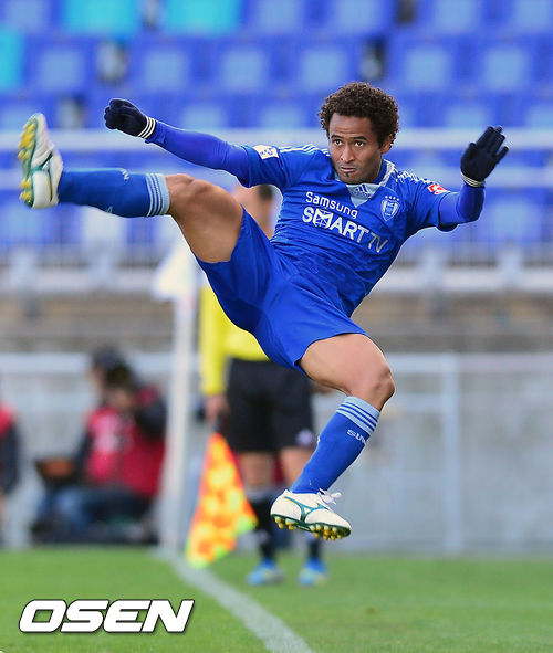 10일 오후 수원월드컵경기장에서 현대오일뱅크 K리그 클래식 2013 수원 삼성과 포항 스틸러스의 경기, 전반 수원 산토스가 선제골에 성공한 후 공중날라차기 세레모니를 펼치고 있다.