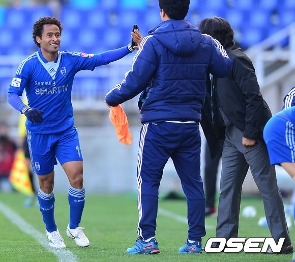 10일 오후 수원월드컵경기장에서 현대오일뱅크 K리그 클래식 2013 수원 삼성과 포항 스틸러스의 경기, 전반 수원 산토스가 선제골에 성공한 후 서정원 감독과 하이파이브를 하고 있다.