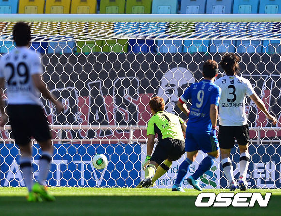 10일 오후 수원월드컵경기장에서 현대오일뱅크 K리그 클래식 2013 수원 삼성과 포항 스틸러스의 경기, 전반 수원 산토스가 선제골에 성공하고 있다.
