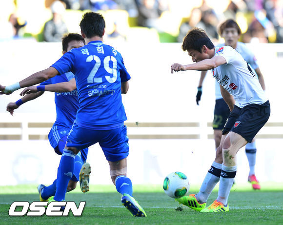 10일 오후 수원월드컵경기장에서 현대오일뱅크 K리그 클래식 2013 수원 삼성과 포항 스틸러스의 경기, 전반 포항 이명주가 동점골을 넣고 있다.