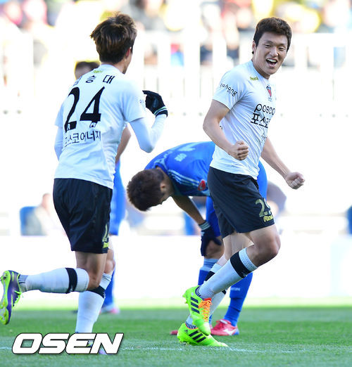 10일 오후 수원월드컵경기장에서 현대오일뱅크 K리그 클래식 2013 수원 삼성과 포항 스틸러스의 경기, 전반 포항 이명주가 동점골을 성공시킨 후 기뻐하고 있다.