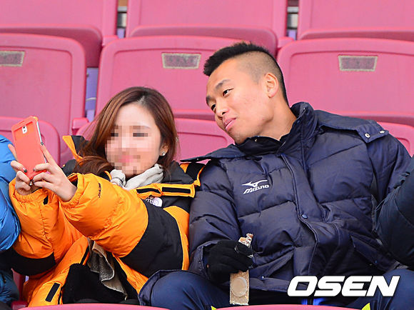 10일 오후 수원월드컵경기장에서 현대오일뱅크 K리그 클래식 2013 수원 삼성과 포항 스틸러스의 경기, 경기관전을 온 울산 현대 김신욱이 지인과 셀카를 찍고 있다.