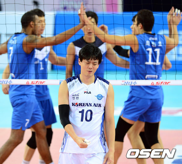 10일 오후 인천계양체육관에서 열린 '2013-2014 NH농협 V리그' 남자부 대한항공과 현대캐피탈의 경기 2세트 현대캐피탈이 득점하자 대한항공 이영택이 아쉬운 표정을 짓고 있다.