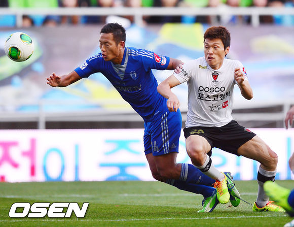 10일 오후 수원월드컵경기장에서 현대오일뱅크 K리그 클래식 2013 수원 삼성과 포항 스틸러스의 경기, 후반 수원 정대세가 슛을 하려 할때 이명주 축구화에 정대세 축구화끈이 엉키며 정대세가 넘어지고 있다.