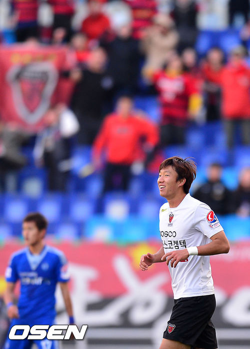 10일 오후 수원월드컵경기장에서 현대오일뱅크 K리그 클래식 2013 수원 삼성과 포항 스틸러스의 경기, 후반 포항 고무열이 역전골에 성공한 후 기뻐하고 있다.