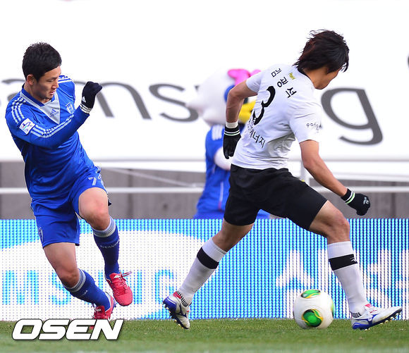 10일 오후 수원월드컵경기장에서 현대오일뱅크 K리그 클래식 2013 수원 삼성과 포항 스틸러스의 경기, 후반 수원 조동건이 포항 김광석에 돌파도중 볼을 뺏기고 있다.