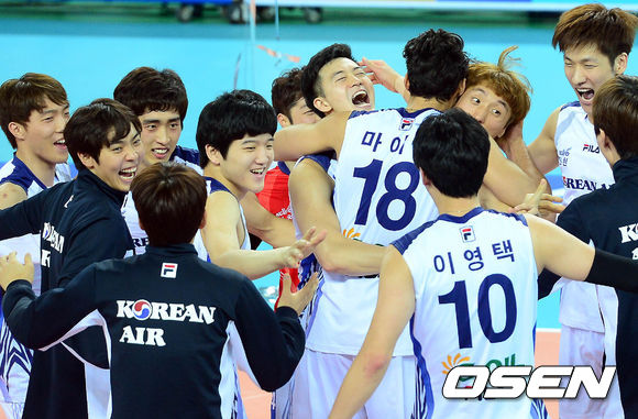 10일 오후 인천계양체육관에서 열린 '2013-2014 NH농협 V리그' 남자부 대한항공과 현대캐피탈의 경기 종료 후 대한항공 선수들이 승리를 기뻐하고 있다.
