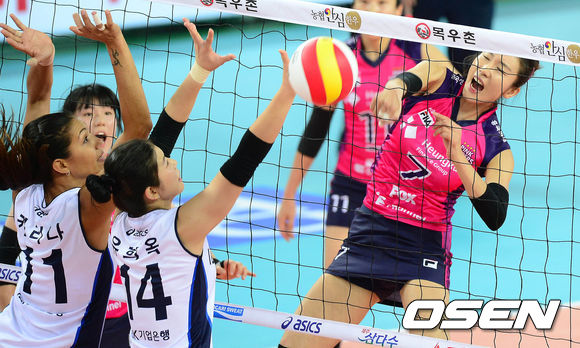 10일 오후 인천계양체육관에서 열린 '2013-2014 NH농협 V리그' 여자부 흥국생명과 IBK기업은행의 경기 2세트 김혜진이 공격을 시도하고 있다.