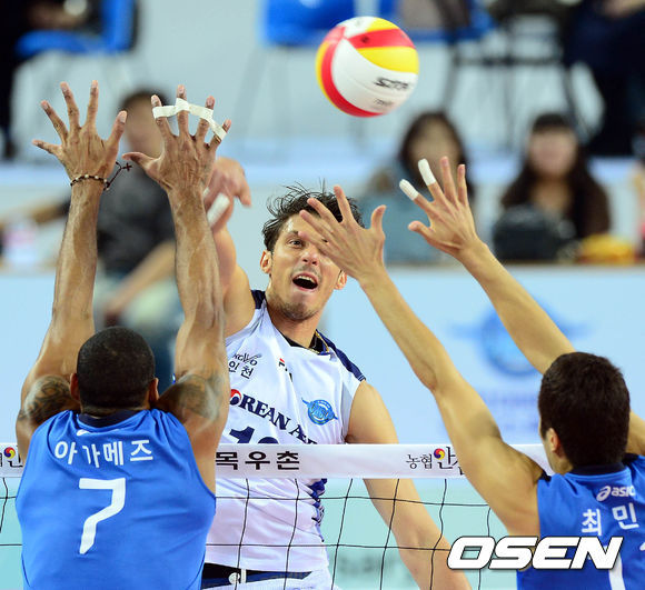 대한항공은 10일 인천계양체육관에서 열린 ‘2013-2014 NH농협 V-리그’ 남자부 현대캐피탈과 홈 개막전서 외국인 선수 마이클 산체스를 비롯, 주축 선수들이 고른 활약을 펼치며 3-1(26-24, 21-25, 25-23, 25-22)로 이겼다.