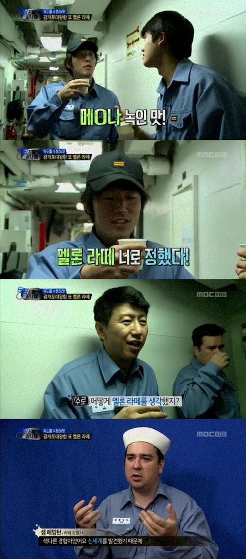 지난 10일 방송된 ‘진짜 사나이’에서 독도 경비 임무를 맡은 서경석, 김수로, 류수영, 손진영, 샘 해밍턴, 장혁, 박형식이 교육을 마친 후 휴식 시간에 광개토대왕함에 있는 멜론 라떼를 마셨다.