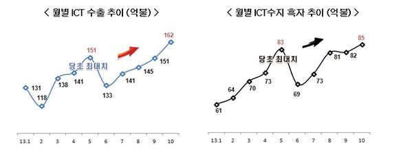 미래부는 10월 ICT수출이 160억 3000만달러(약 17조 880억 원)를 기록하며, 84억 7000만불(약 9조 290억 원)의 흑자를 냈다고 11일 밝혔다. 각각 11.6%와 19.7% 상승한 기록이다.