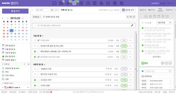 먼저, 메일 서비스와 캘린터 서비스 우측에 화면 이동 없이 일정, 할일, 메모, 연락처, N 드라이브 등 다른 서비스를 이용할 수 있는 위젯 기능을 추가했다. 이를 통해 메일 혹은 캘린더 화면에서 일정/할일/메모 등록은 물론 N드라이브 파일 저장도 가능해 사용자들의 업무 효율을 높일 수 있게 됐다.