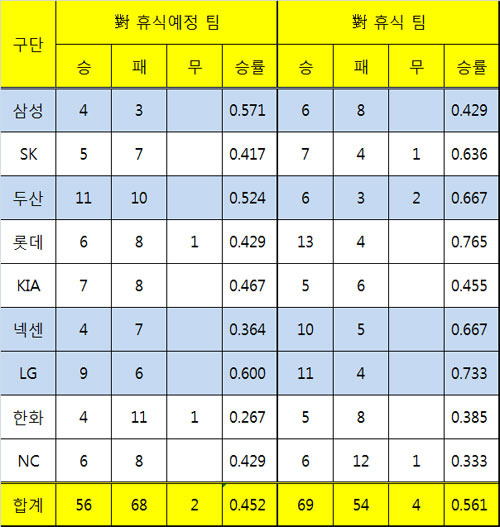 구단별 휴식 예정 팀과 휴식 팀의 팀 간 상대전적(표 참조)을 보면 휴식 예정 팀에 대한 전 구단의 성적이 56승 2무 68패로 승률 5할에 훨씬 못 미쳐 4할5푼2리에 그쳤다. 반면 휴식 팀과의 대결에서는 69승 4무 54패로 승률 5할을 훌쩍 넘겨 5할6푼1리를 기록했다.