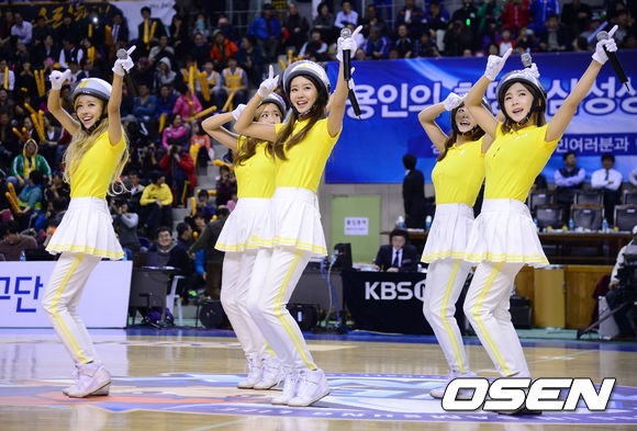 11일 오후 용인실내체육관에서 열린 '우리은행 2013-2014 여자프로농구' 삼성생명과 KB스타즈의 경기에서 크레용팝이 축하공연을 하고 있다.