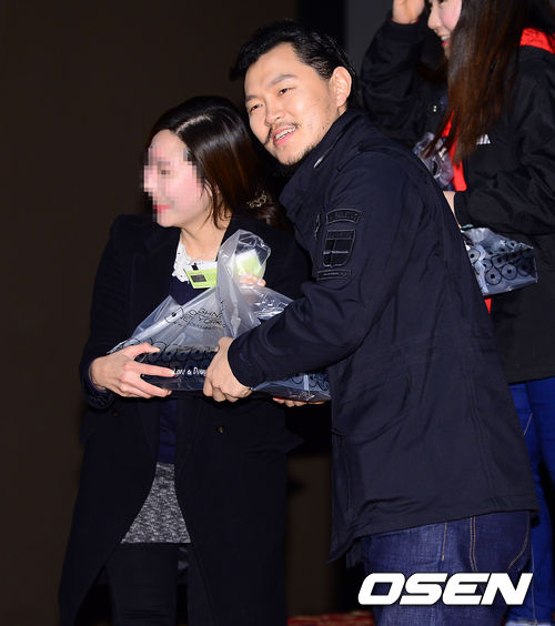 배우 양동근이 팬에게 선물을 건네며 취재진을 향해 포즈를 취하고 있다.