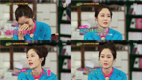 이날 선행, 기부에 관련해 솔직한 대화를 나누던 성유리는 “부모님께 모든 활동 수입을 맡기던 중 몇 년 전부터 용돈을 받게 됐다”며, “좋아하는 물건을 살까도 고민했으나 처음으로 받게 된 나만의 돈을 함부로 쓰기가 아깝더라”고 자신이 기부금을 모으게 된 계기를 설명했다.