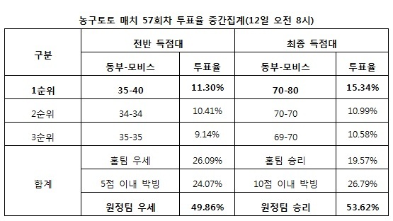 국민체육진흥공단(www.kspo.or.kr)이 발행하는 체육진흥투표권 수탁사업자 스포츠토토의 공식 온라인 발매사이트인 베트맨(www.betman.co.kr)이 오는 13일 오후 7시 원주종합체육관에서 열리는 동부-모비스전을 대상으로 한 농구토토 매치 57회차 투표율을 중간 집계한 결과, 53.62%가 원정팀 모비스의 우세를 예상했다고 전했다. 동부의 승리를 예상한 참가자는 19.57%에 불과했고, 나머지 26.79%는 양 팀 10점 이내 박빙 승부를 전망했다.