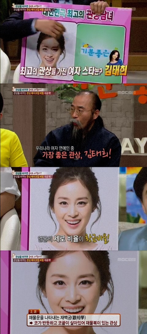 12일 방송된 MBC ‘기분 좋은 날’에서 ‘관상을 바꾸면 운명도 바뀐다?!’라는 주제로 얘기를 나누던 중 조규문 관상전문가가 국내 연예인 중 최고 관상을 가진 스타가 김태희라고 밝혔다.