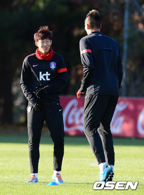 손흥민, 김신욱이 훈련을 하며 이야기 나누고 있다.