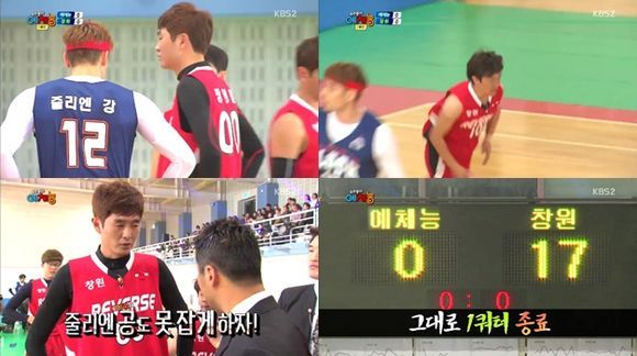12일 오후 방송된 KBS 2TV '우리동네 예체능'에는 예체능팀 멤버들이 경남 창원팀과 두 번째 농구대결을 펼치는 모습이 전파를 탔다.