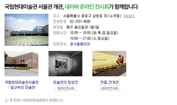 네이버가 온라인에서 국립현대미술관 개관특별전을 동시에 개최한다. 네이버는 국립현대미술관 서울관 개관에 맞춰 5개 특별전시를 네이버에서도 동시 제공한다고 13일 밝혔다.